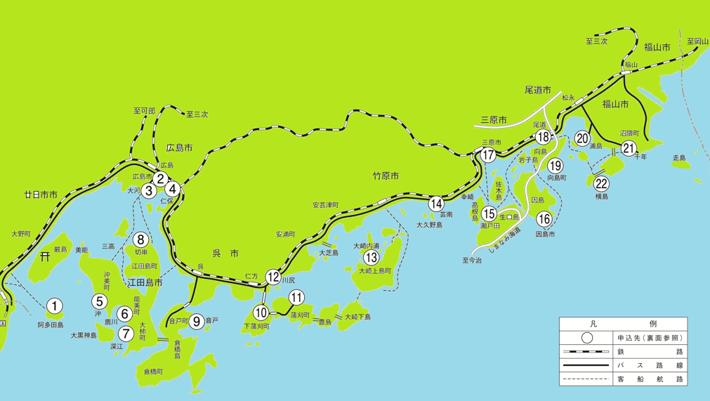 【広島県の観光漁船及び漁業体験】 ※①~⑪、⑬~㉒は観光漁船 ※⑪⑬㉒は観光漁船と漁業体験 ※⑫は漁業体験 -該当地区の番号をクリックしてください-